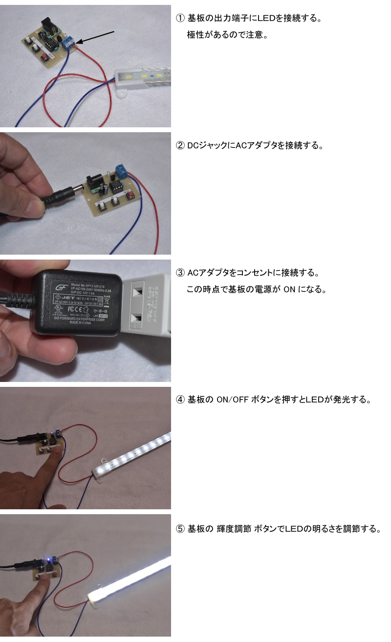 商品説明 LED を接続して輝度の調節を行う回路です。DC12V 800mA まで制御できます。 基板に3つのボタンがあり、ON/OFF、輝度(+)、輝度(-)になり、輝度調節は10%〜100%の範囲で明るさが変化します。 LED および ACアダプタは別途用意して下さい。基板の DCジャック は、2.1mm標準DCプラグ (外径5.5mm、内径2.1mm、センター(+)) 対応です。 点灯試験では Amazon で購入した DC12V駆動の 「SODIAL 50CM5630 SMD36」 を使用しました。 電流値は DC12V直付けで 約487mA、輝度調節回路に接続し100%点灯で 約424mA です。 ![]() LED輝度調節回路 の 仕様 基板サイズ : 47mm x 36mm 駆動電圧 : DC6V 〜 DC12V 制御電流 : 800mA ON/OFF 制御 : ゆっくり点灯、ゆっくり消灯 輝度調節 : 10% 〜 100% (PWM制御 1%単位) ![]() LED輝度調節回路 の 紹介動画 セット内容 LED輝度調節回路 基板 x 1枚 (LEDおよび電源(ACアダプタ)は用意して下さい) ![]() 使用手順 「SODIAL 50CM5630 SMD36」を使用した場合の接続例 ![]() |